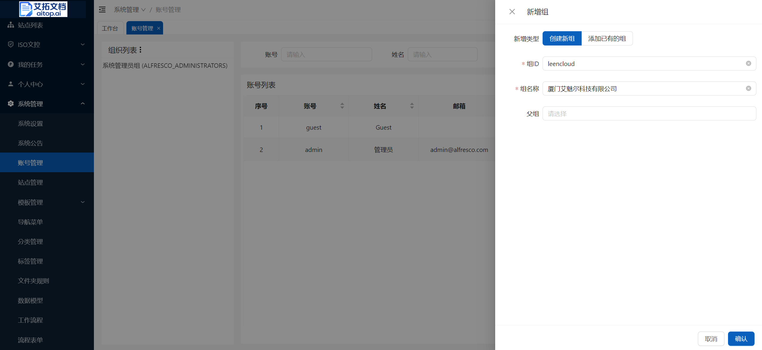 - 父组:选择所属父组,如果创建顶级组织,则删除留空