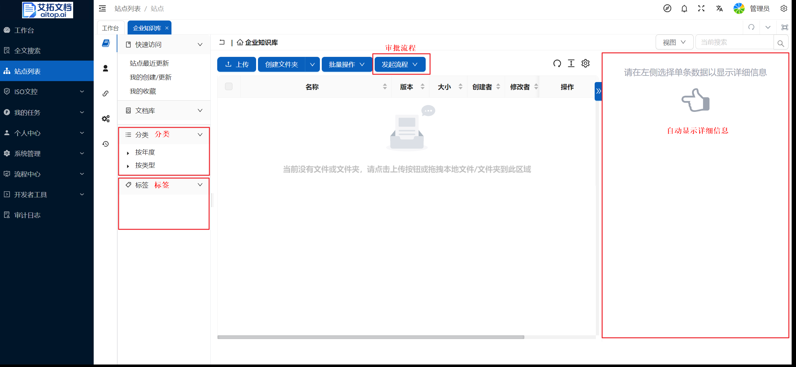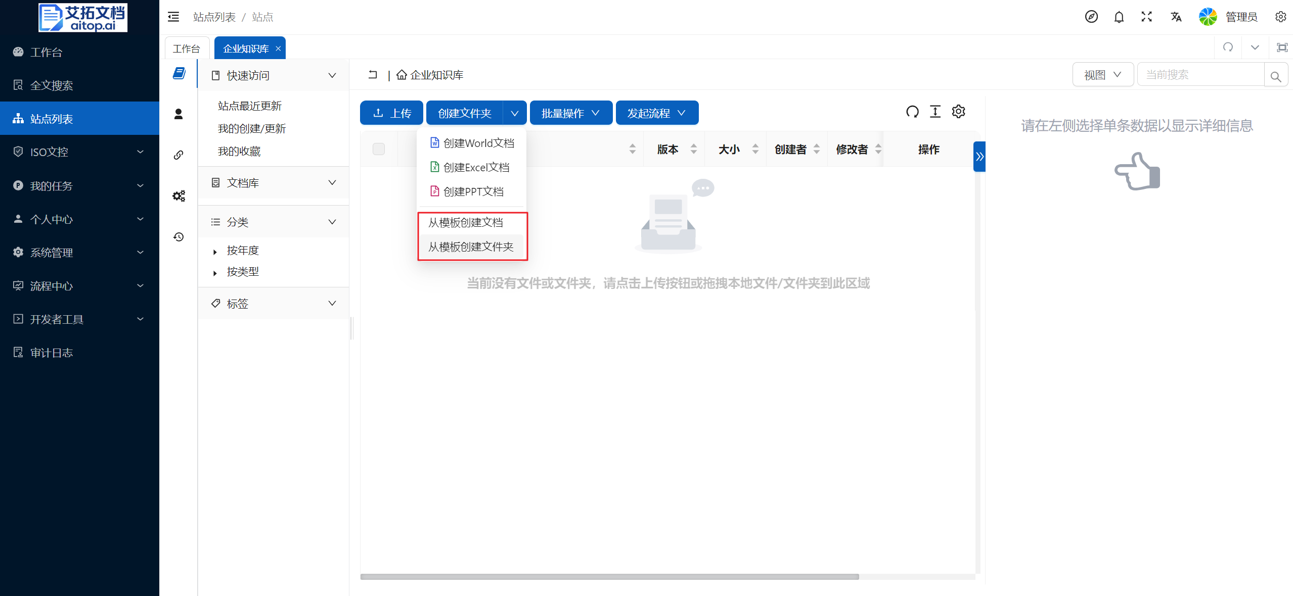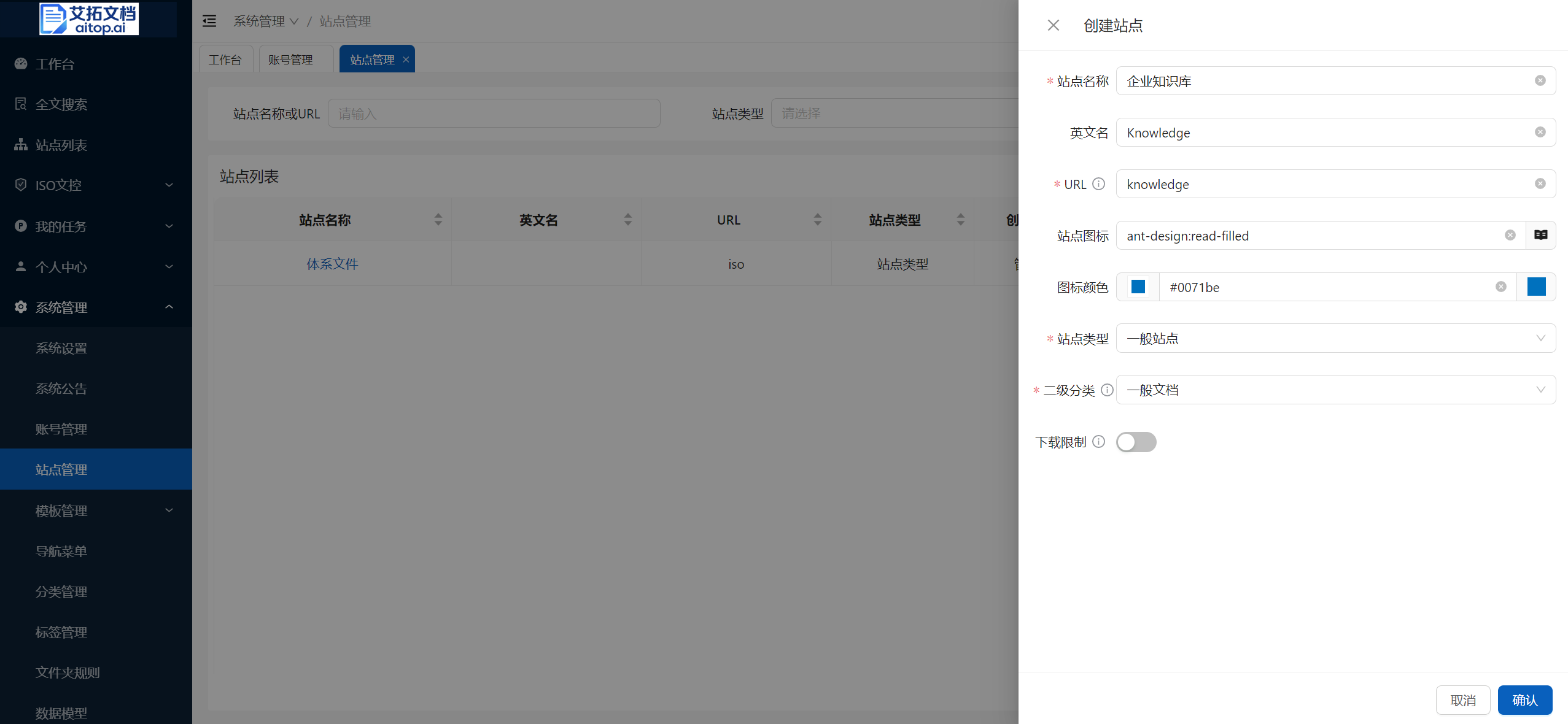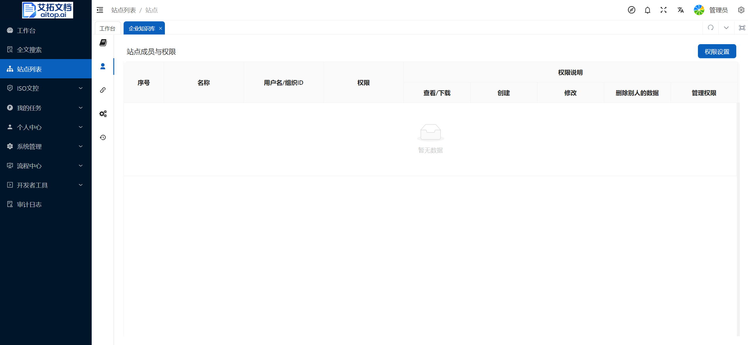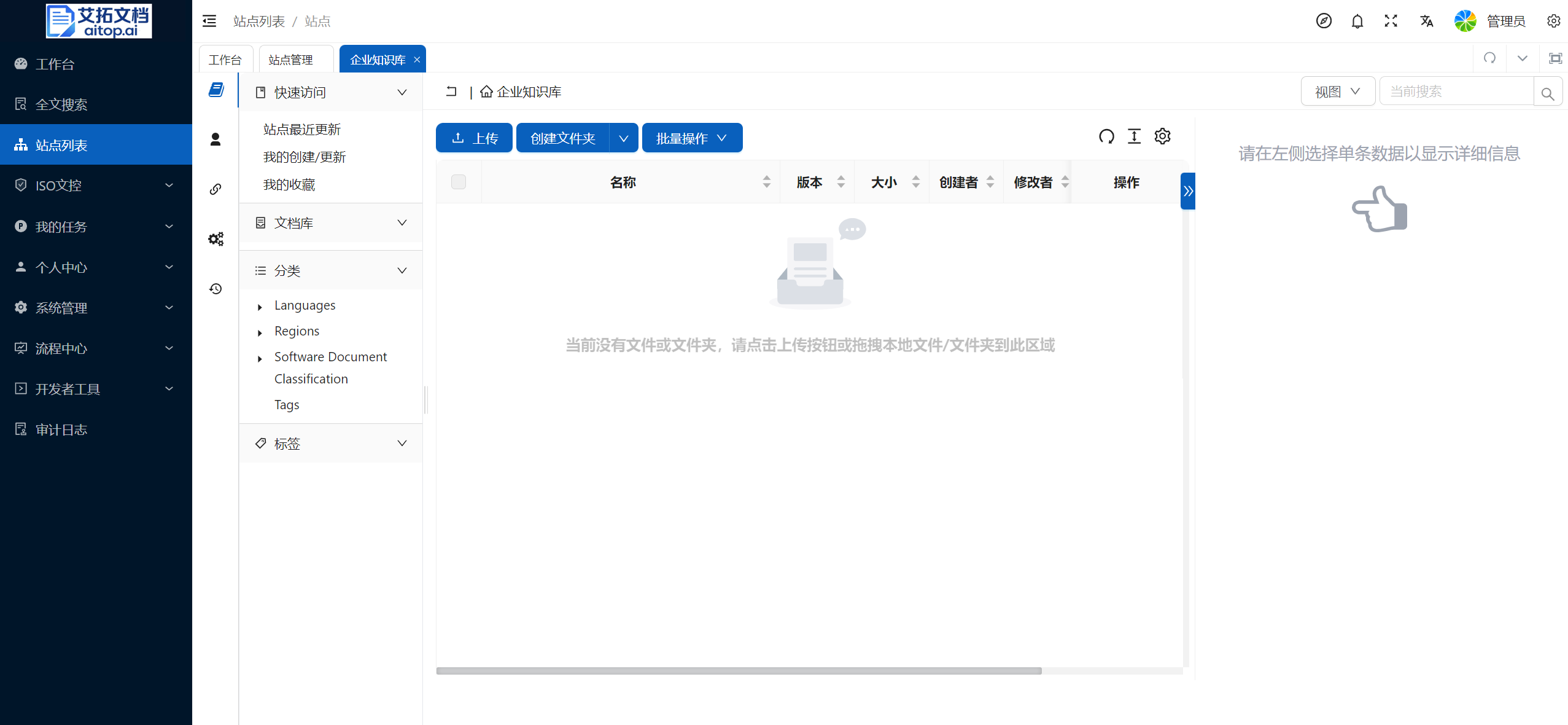 站点的概念:站点是艾拓文档中管理文档的最大单位,不同站点间的数据、权限等相对独立,可根据实际业务需求划分站点。