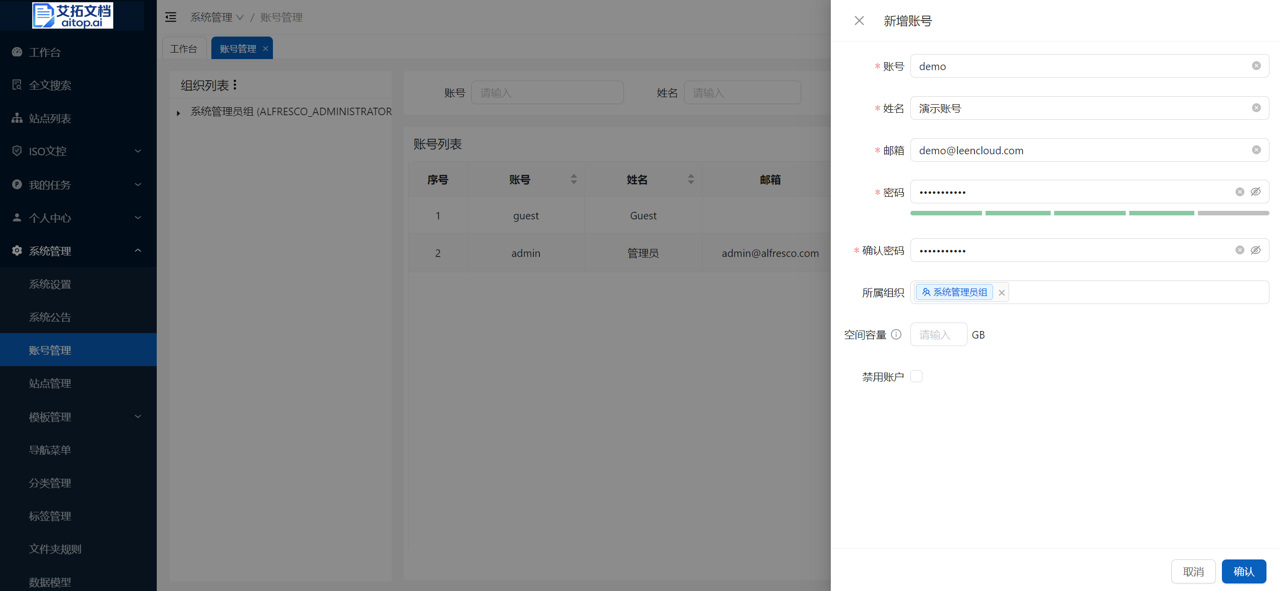 - 密码/确认密码:账号的登录密码,建议使用6位数以上数字、英文大小写、特殊字符混合组成的密码