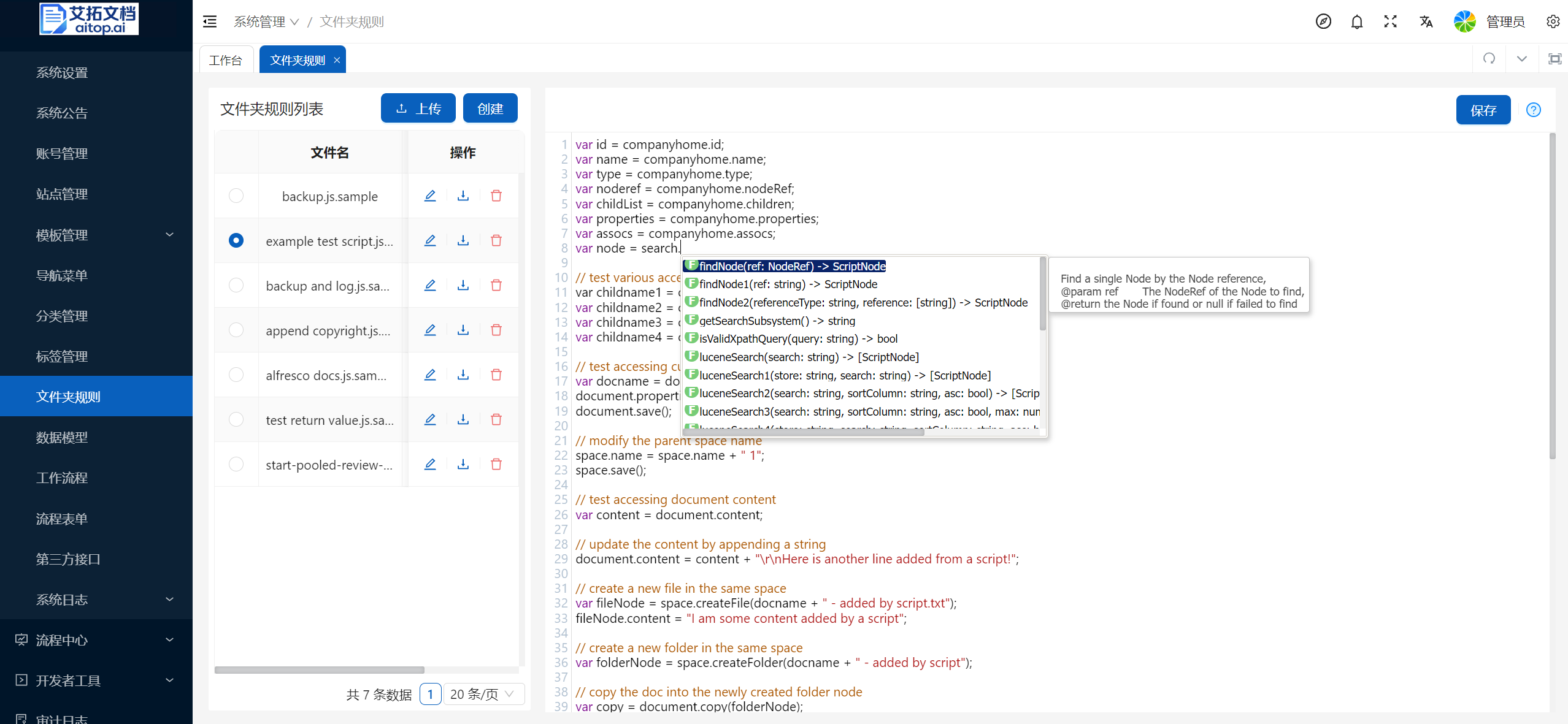 4、关于文件夹规则脚本Javascript的语法,可参考:Alfresco JavaScript API