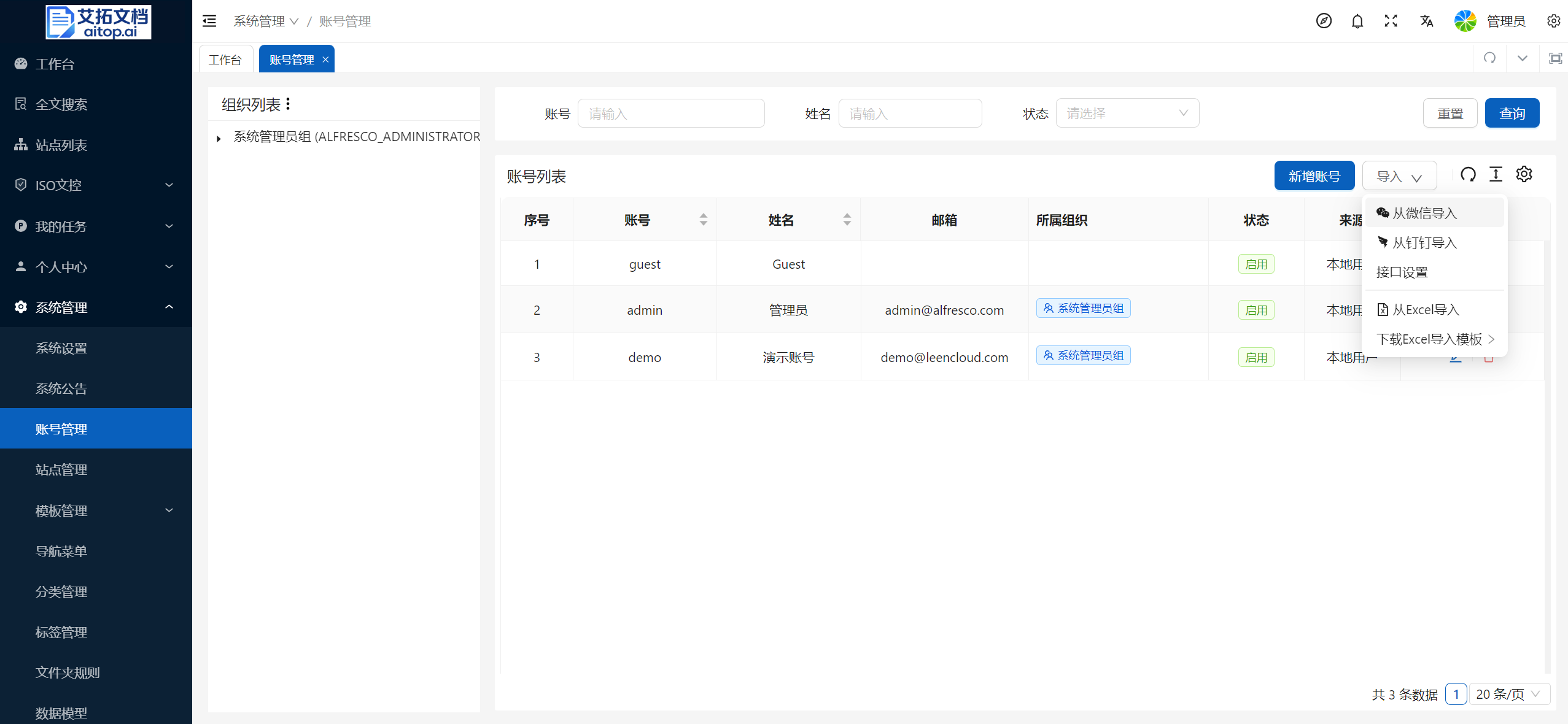 3、设置好后,可以在 系统管理 > 账号管理 页面,从钉钉批量导入组织和用户