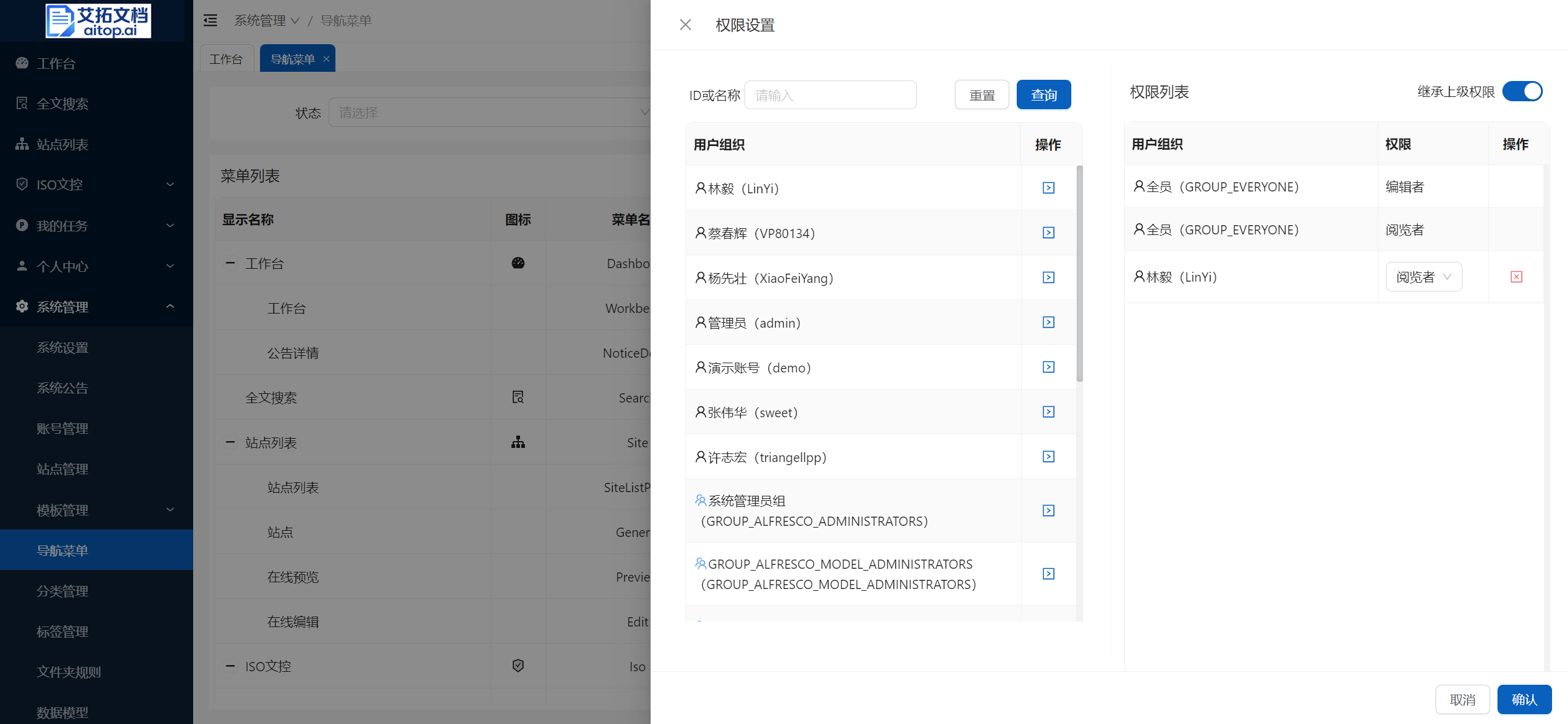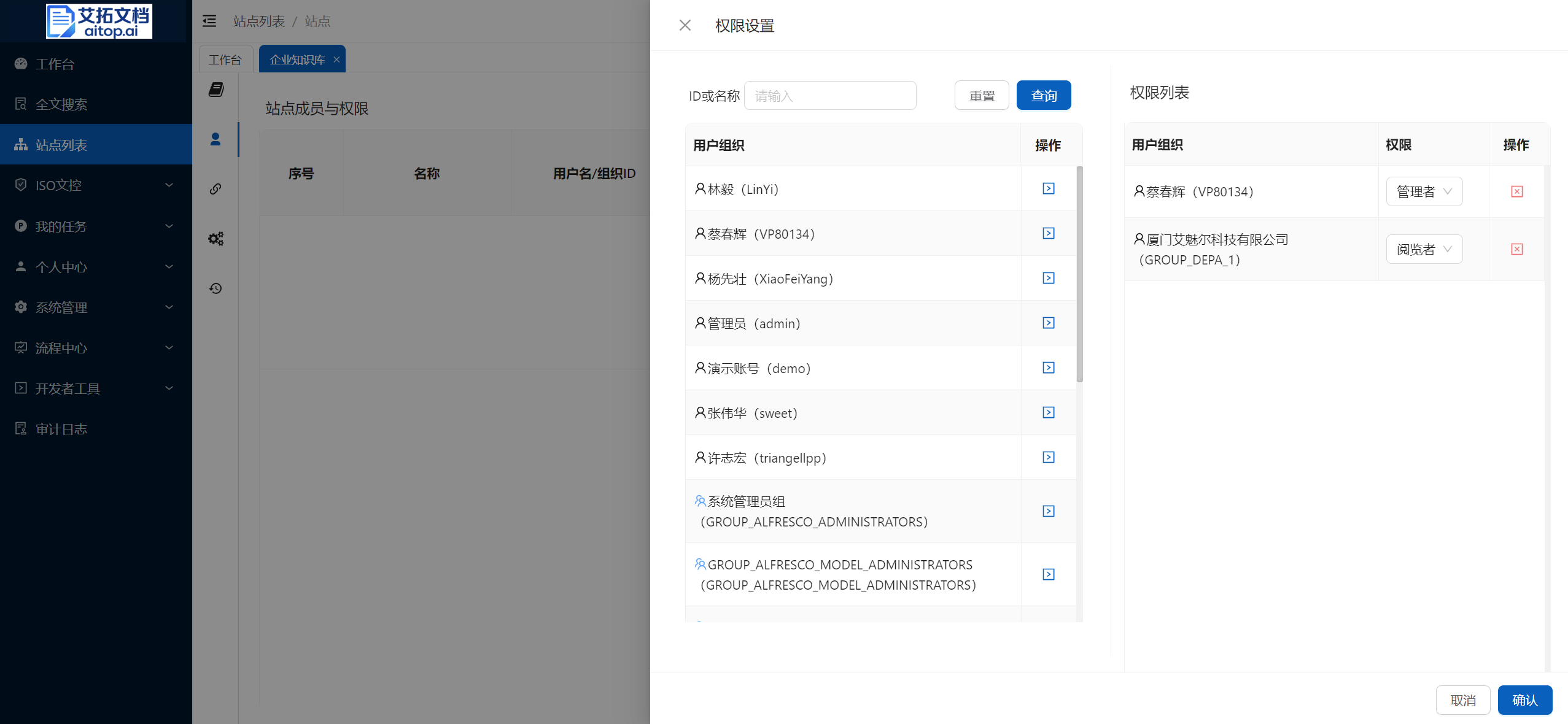 4.3、点击工具栏的 权限设置,在左侧搜索用户和组织,点击操作栏的按钮添加到右侧,在右侧选择对应的权限,点击 确认 按钮。