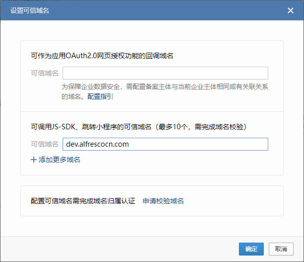 点击 开发者接口 > 网页授权及JS-SDK > 设置可信域名,在第二栏中填入应用域名,点击确定