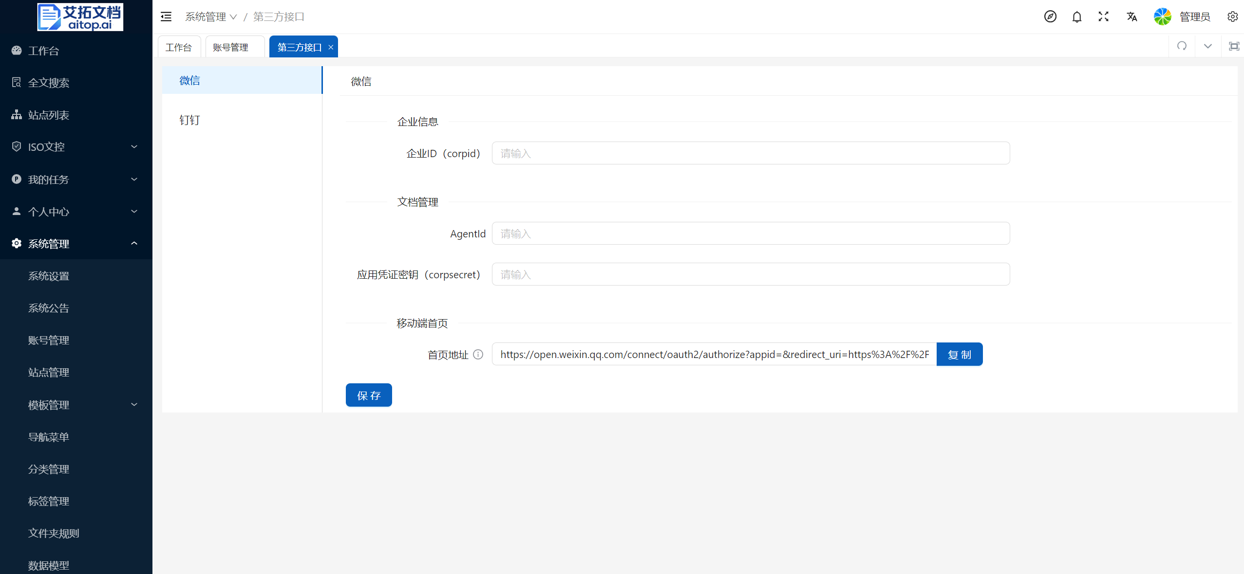 3、使用公司企业微信管理员账号登录企业微信,复制以下信息填写到艾拓文档接口设置页面,点击 保存 :