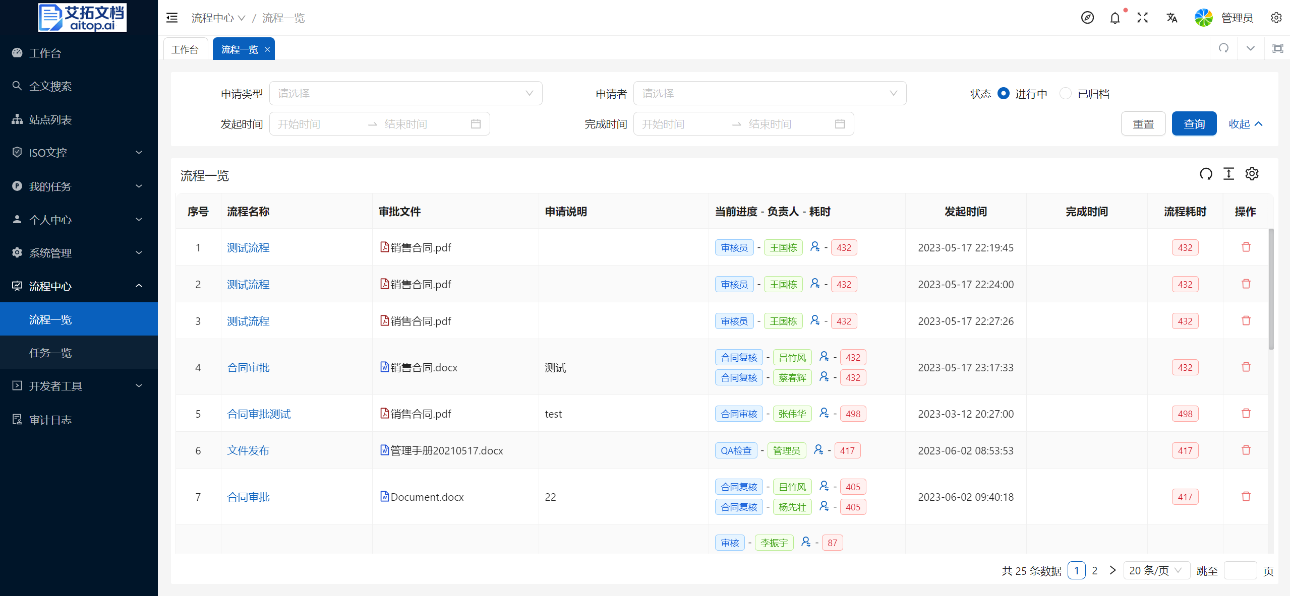 本页面列出系统中的所有工作流程,方便系统管理员监控流程状态。