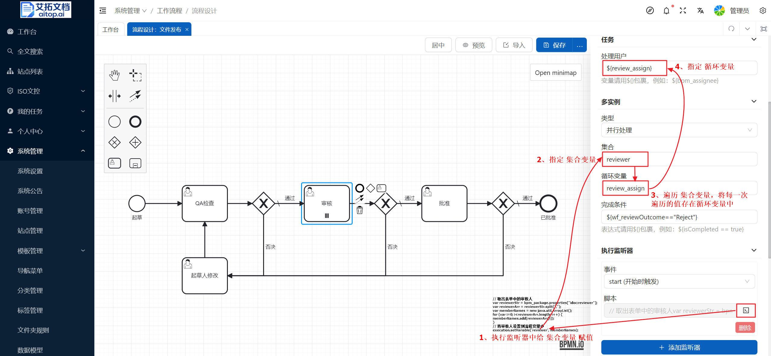 - 循环变量:将集合中变量指定的数组循环遍历,将每一次遍历的值存在循环变量中,任务的处理用户属性中,可以直接指定这个循环变量