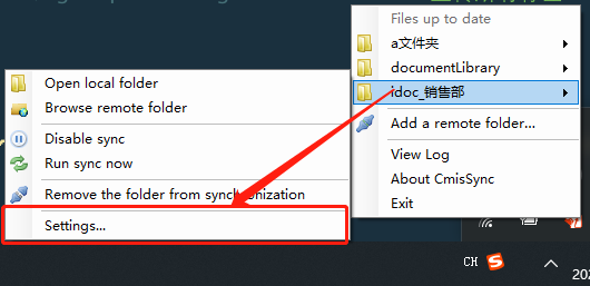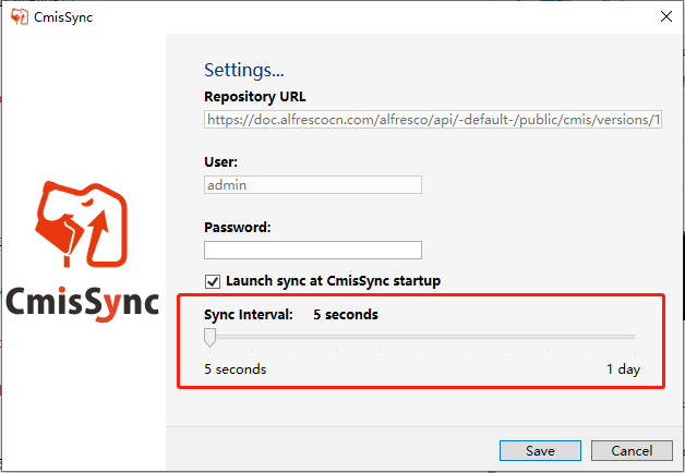 鼠标右键点击电脑托盘区的CmisSync图标,点击Settings,在弹出框中设置同步的时间间隔。