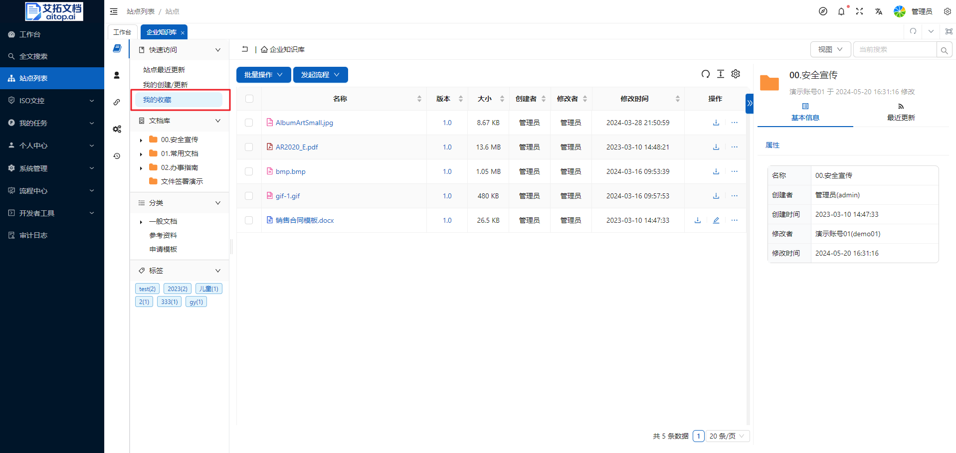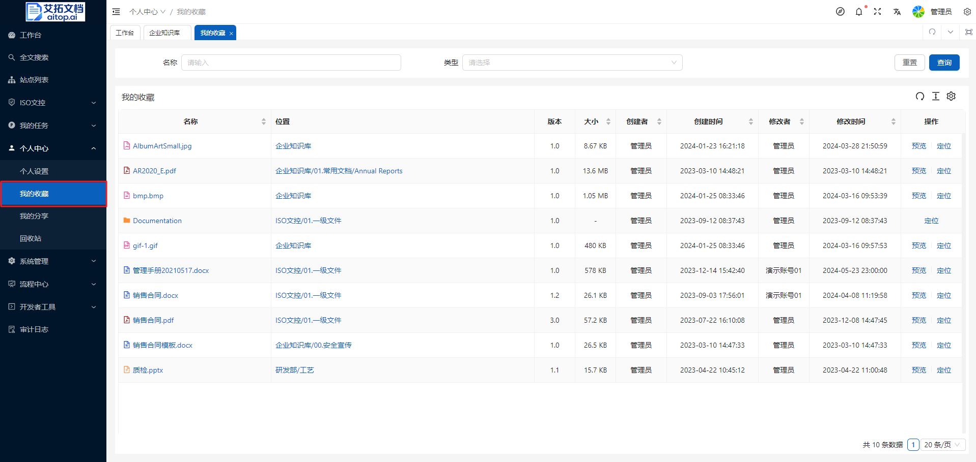 在文档库左侧 导航面板 的 快速访问 区域,点击 我的收藏,可快速过滤显示出此站点中已收藏的文档/文件夹