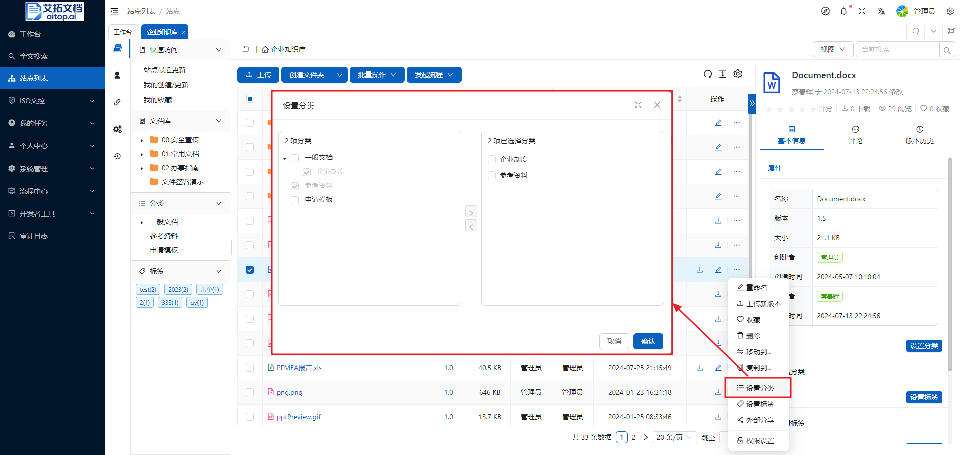 - 点击文件列表操作列的 更多 按钮,选择 设置分类
