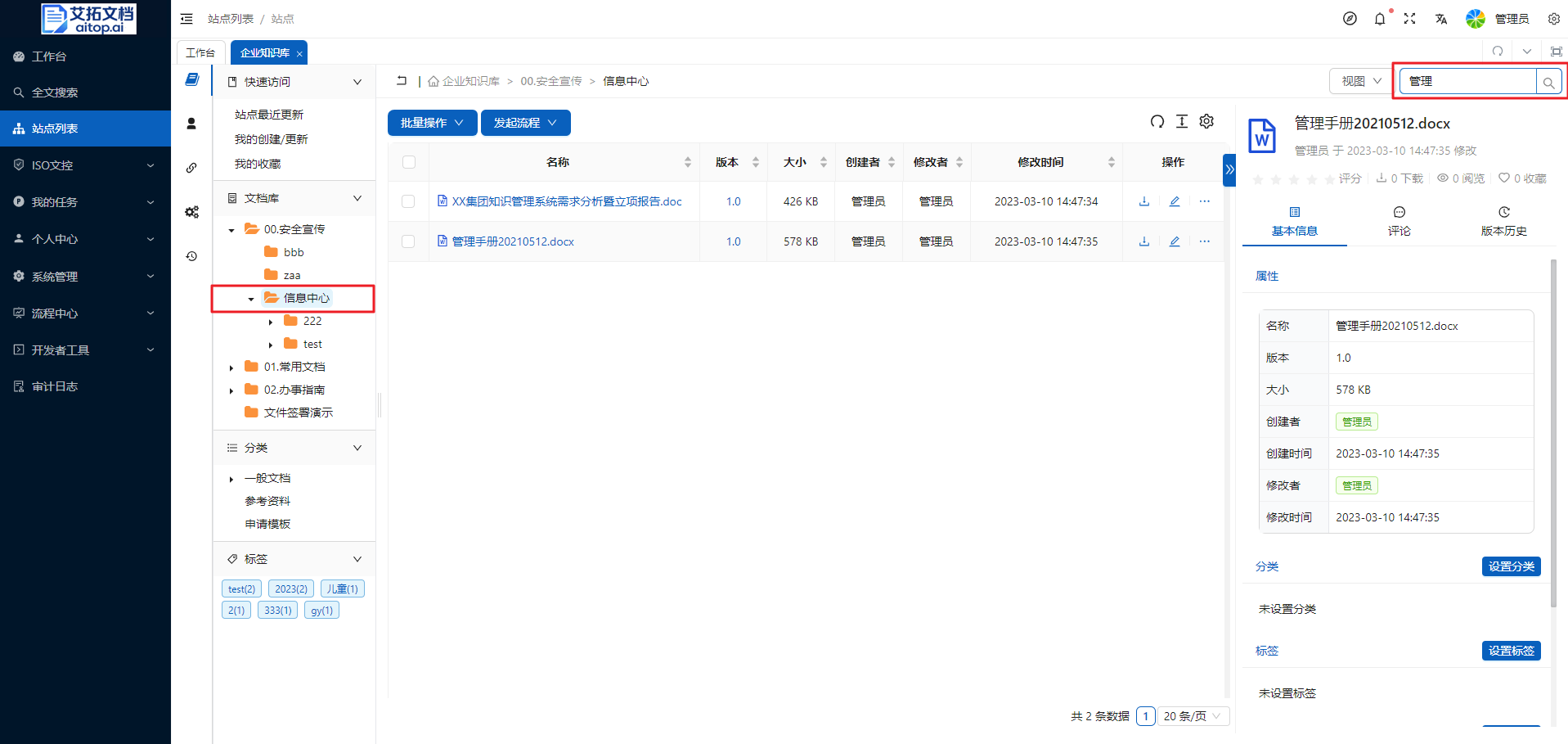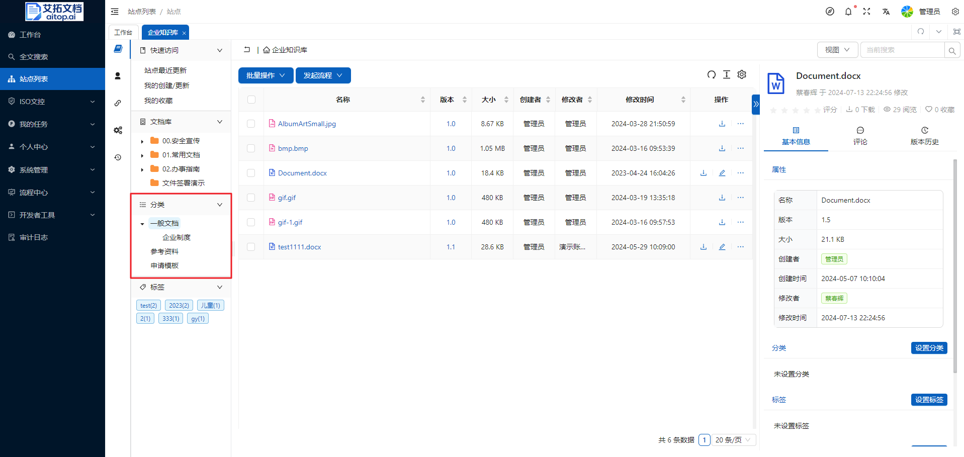 - 一般用户就可以添加标签关键词,而分类的树形结构需要系统管理员在系统后台设置好,一般用户只能为文档选择系统中已有的分类