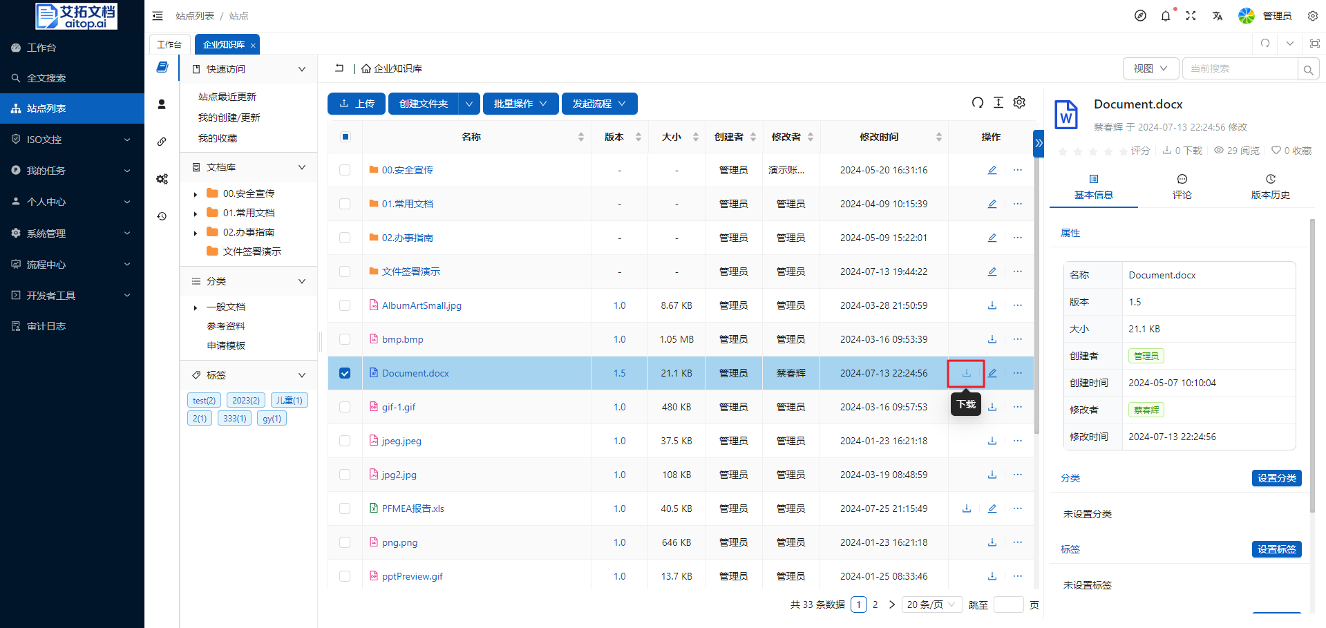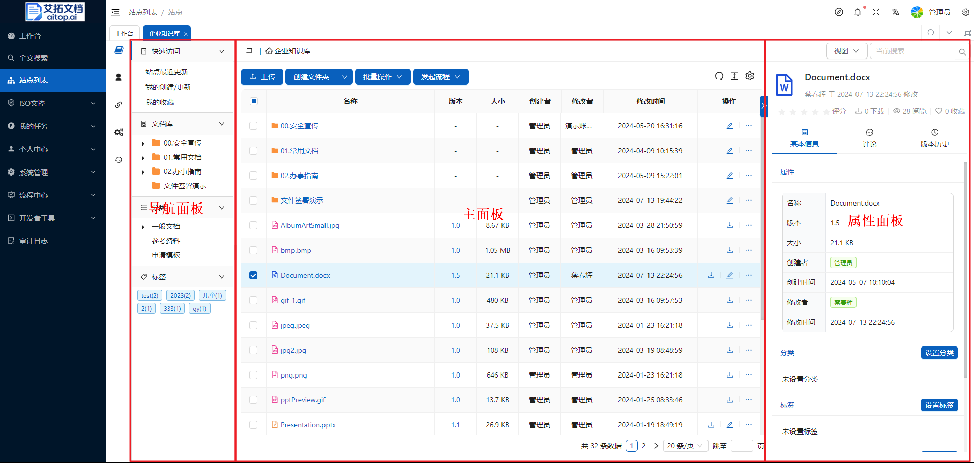 - 属性面板:该面板通常包含与主面板中所选项目相关的属性信息,以及部分功能的操作按钮。显示的属性信息以及操作按钮取决于所选项目(文件夹、文档)的权限设置。