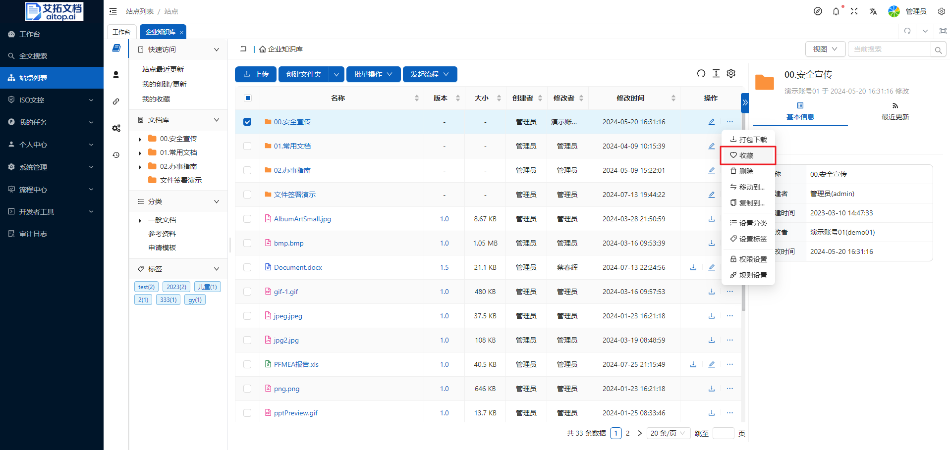 - 点击文件列表操作列的 更多 按钮,选择 收藏