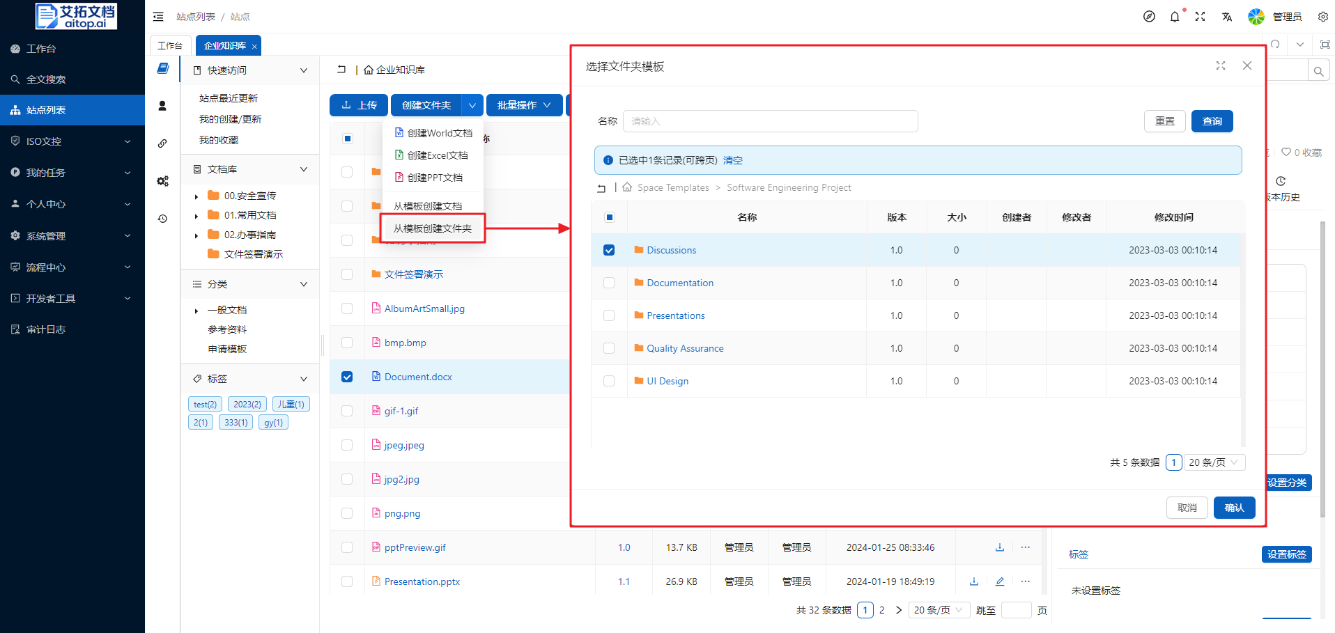 - 从模板创建文件夹:为了方便用户快速初始化文件夹结构,可通过“从模板创建文件夹”功能,将系统中预置的文件夹结构批量导入到相应目录下。系统中预置的文件夹结构可由系统管理员在系统后台进行维护。