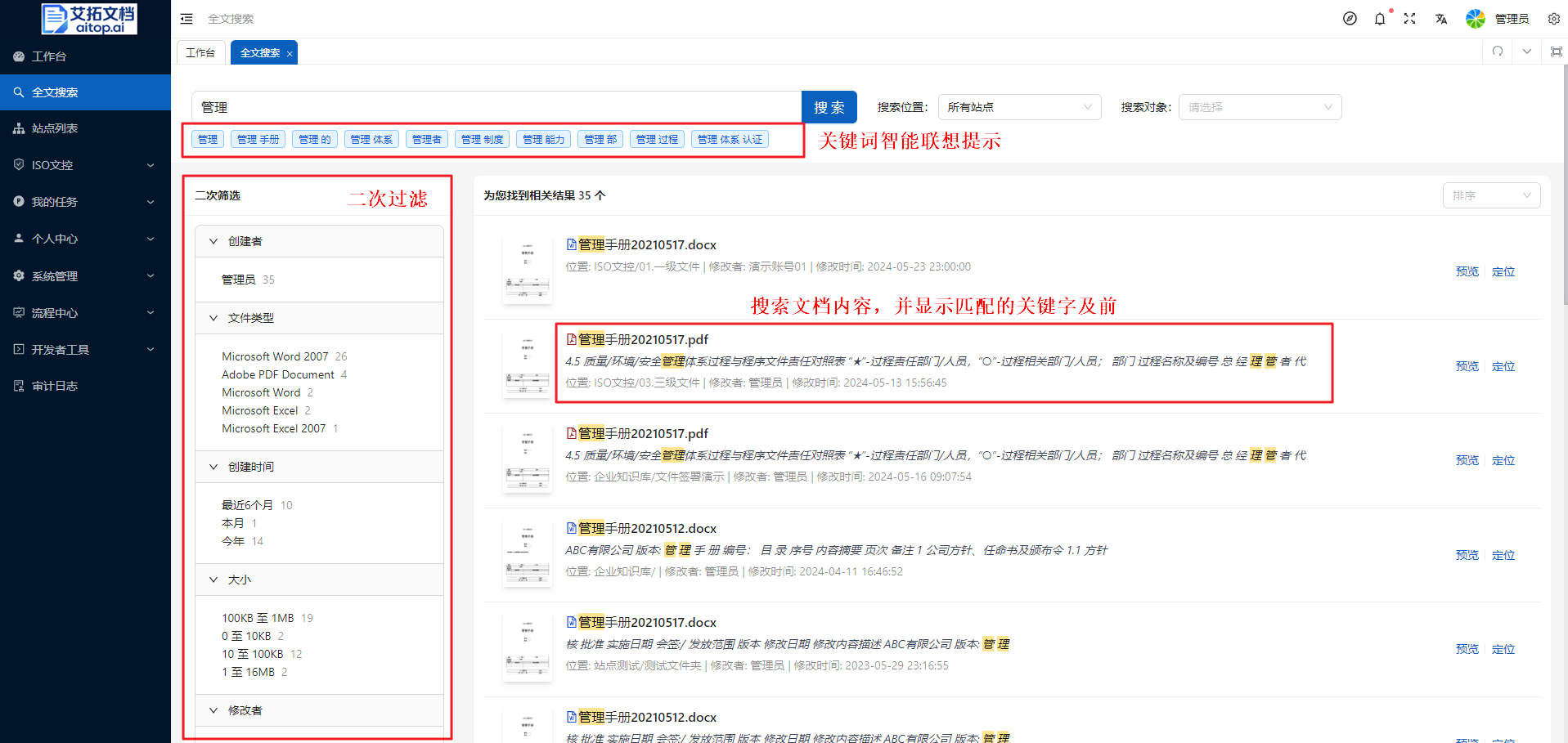 全文搜索可以让用户使用关键字搜索文档内容,并显示匹配的关键字及前后文。