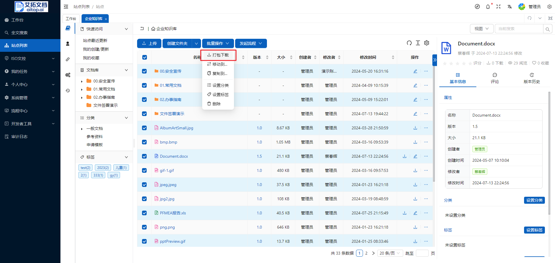 多文档/文件夹打包批量下载:在文件列表选择要打包下载的文档/文件夹,然后点击工具栏的 批量操作 > 打包下载