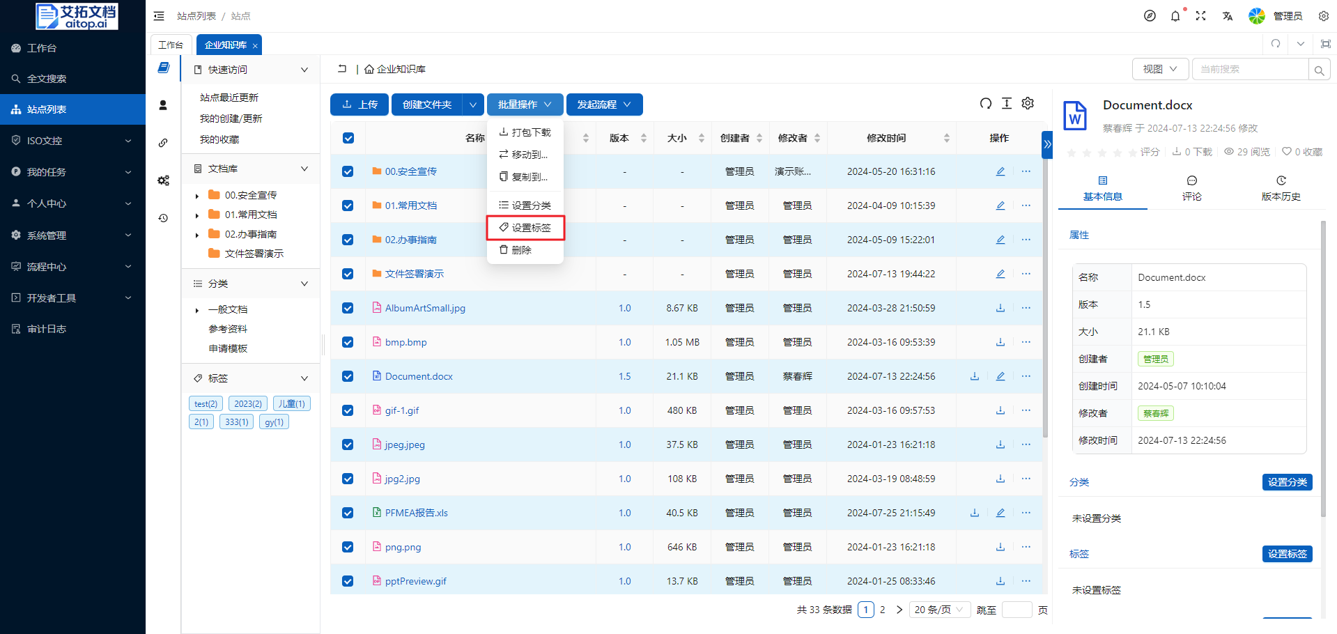 - 在文件列表选择要设置标签的文档/文件夹,然后点击工具栏的 批量操作 > 设置标签