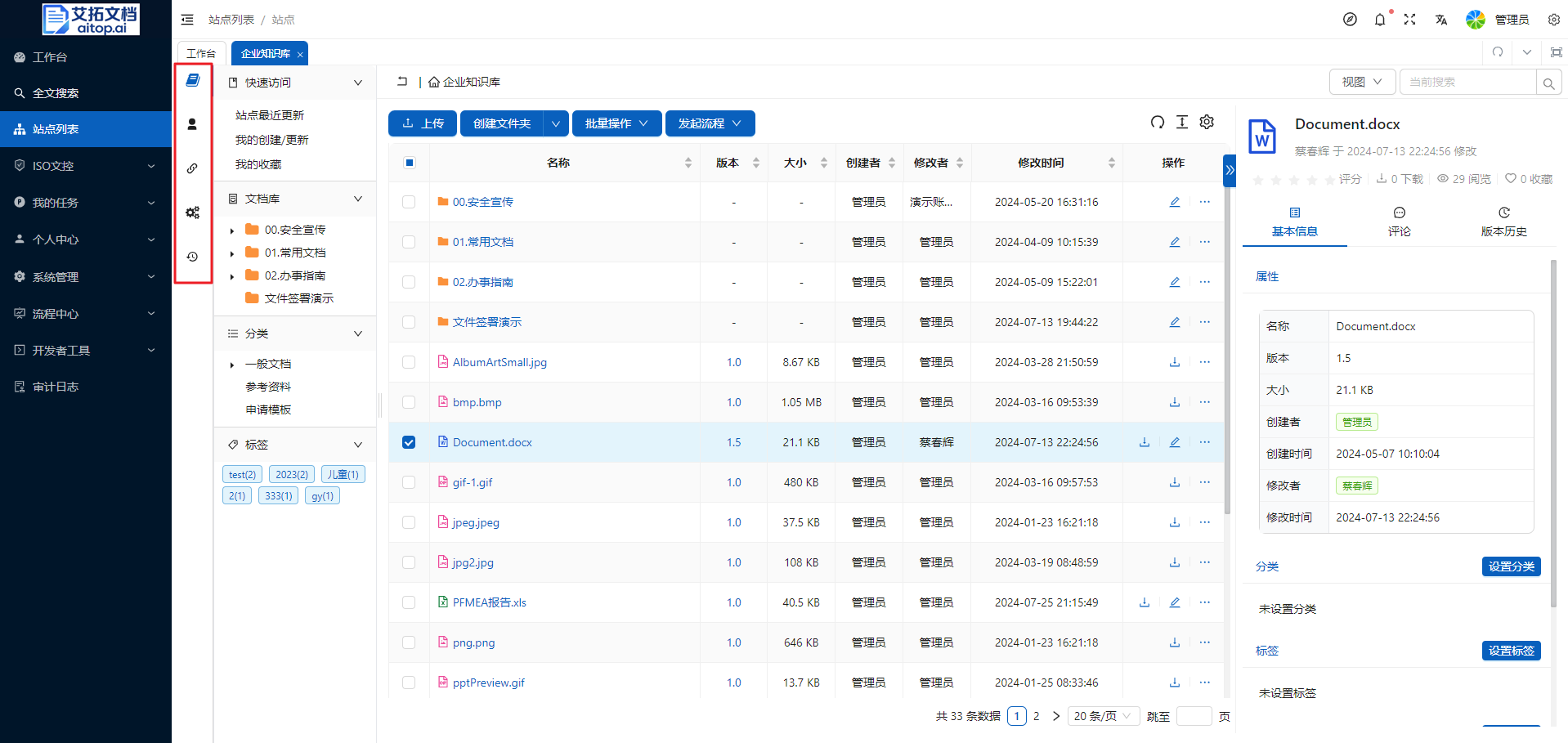 - 站点设置:包含审批流程、分类、分类根节点、标签、自动显示详细信息、规则设置等