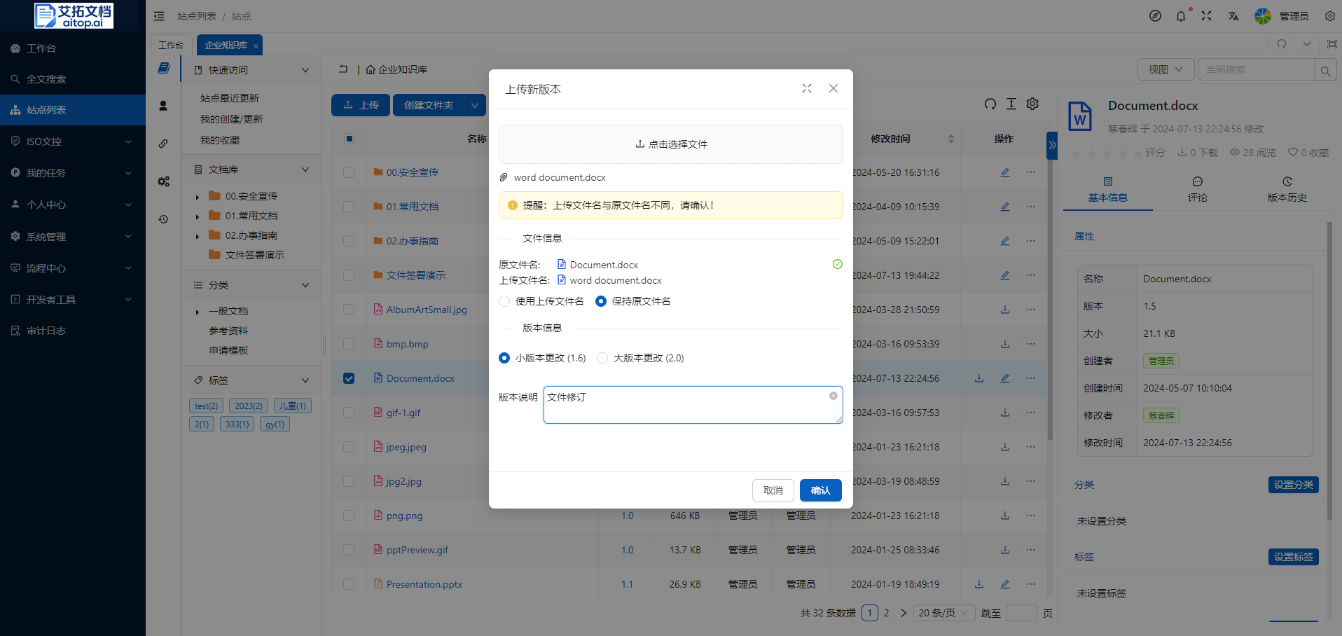 - 在上传新版本弹出框中,选择本地文件作为新版本(如果新旧文件名不一致,系统会自动给出提示),选择版本信息,填写版本说明后,点击 确认 按钮