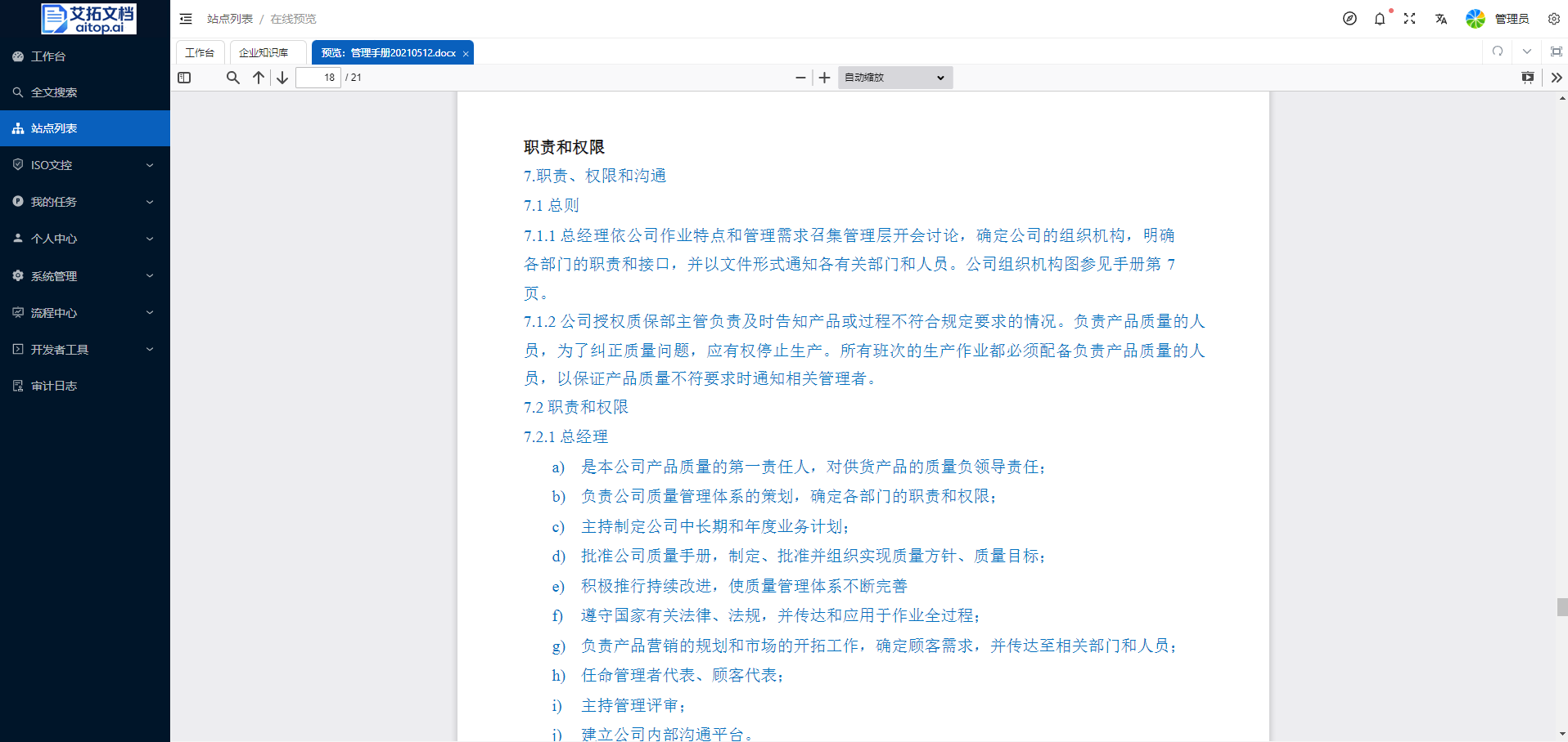 系统支持对任意的文件夹/文档设置单独的权限。当没有特别设置权限时,将默认继承上级文件夹的权限设置。顶层文件夹默认继承站点的权限设置。用户可选择继承或切断权限继承关系。