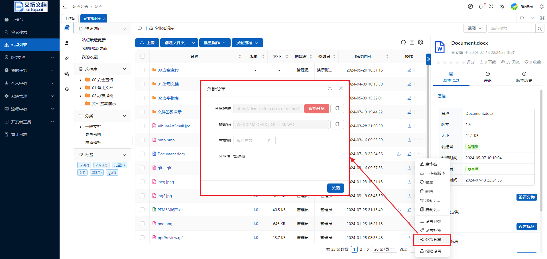 用户如果需要将文档分享给外部用户查看,可以采用生成外部链接的方式,即便对方没有账号也可以根据分享时提供的链接和提取码查看文档。