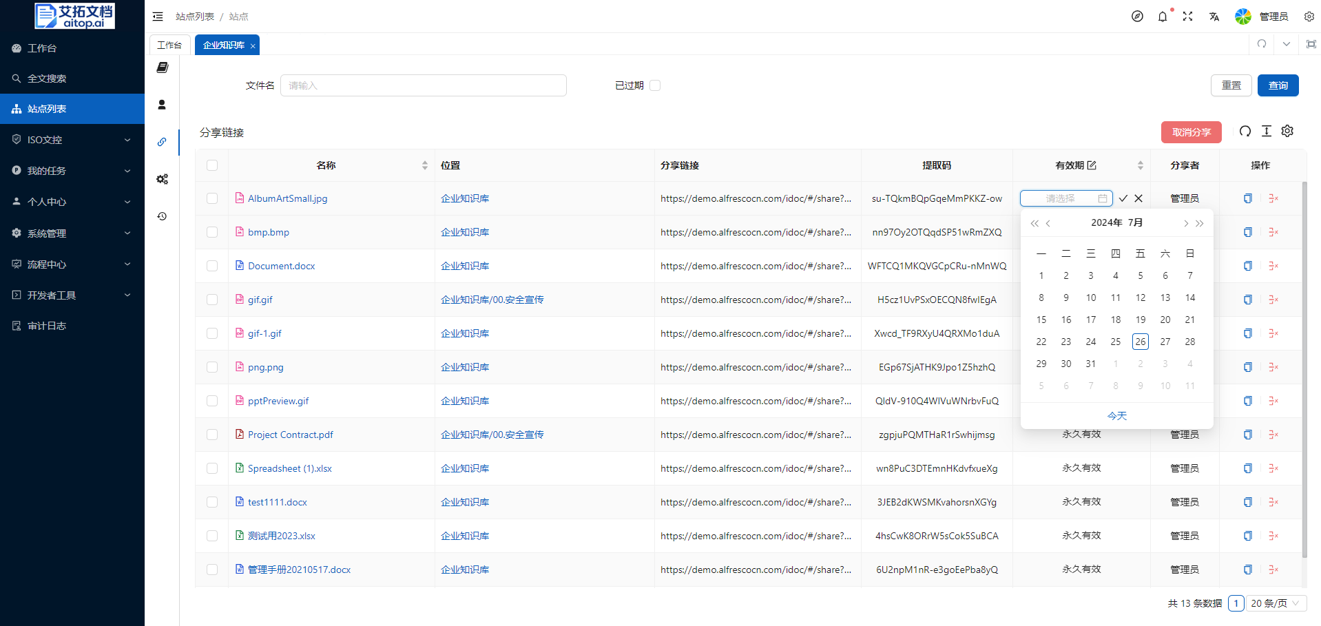 - 点击分享链接列表的 有效期列,可以修改有效期
