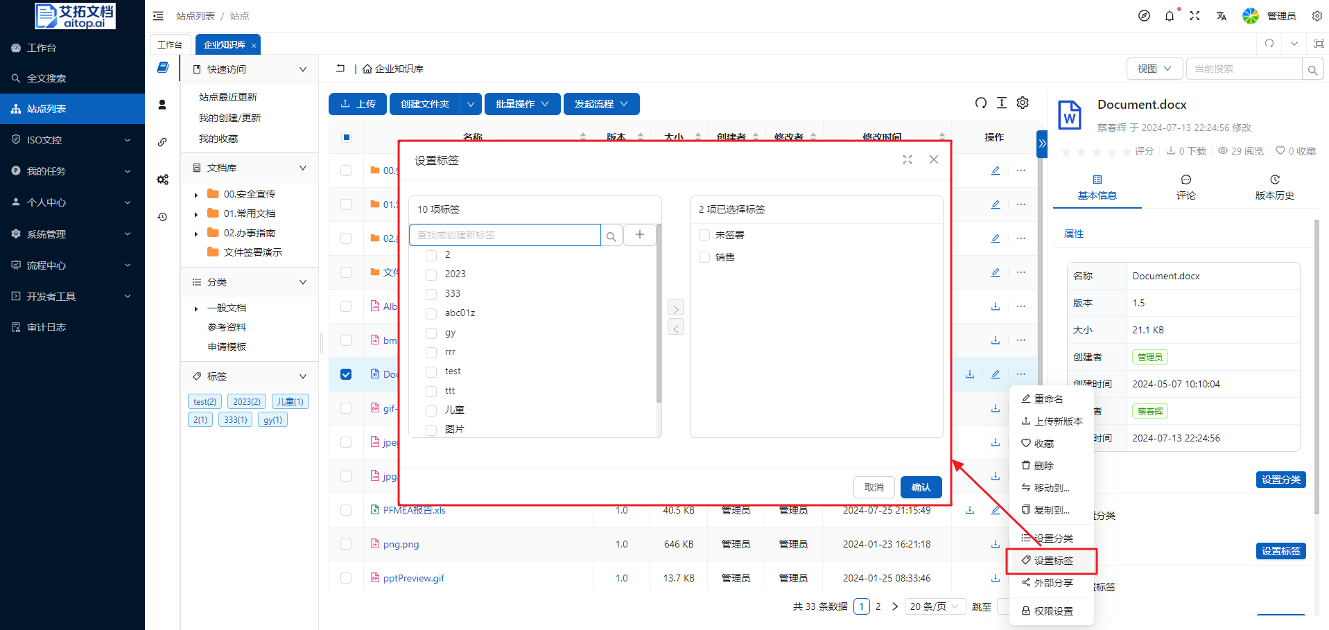 标签可以让用户根据文档的特点来标记文档,帮助用户更便捷和快速的找到自己所需要的文件,标签类似于文档关键词的概念。
