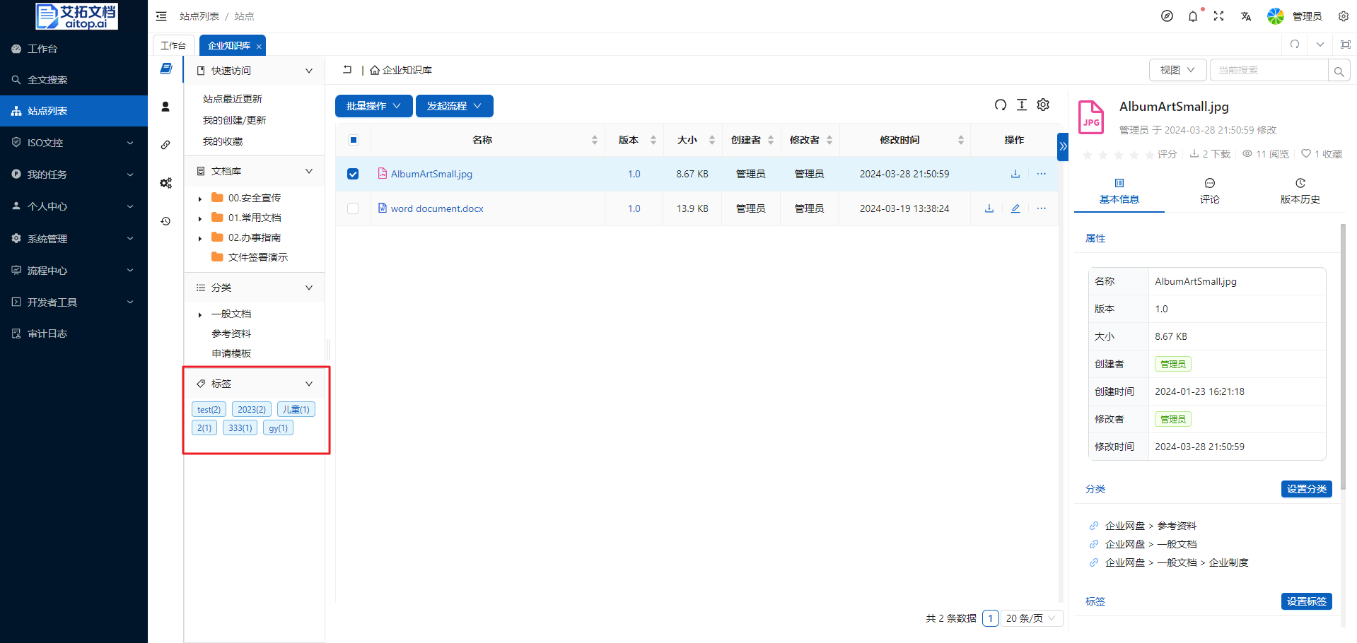 当站点中有文档设置标签后,在文档库左侧 导航面板 的 标签 区域,将会显示被使用的标签,以及每个标签对应的文档数。点击标签,将自动过滤出标签对应的文档。