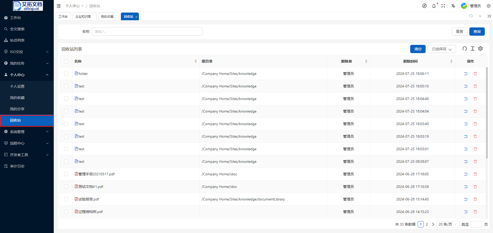 - 点击回收站列表 操作 列,可以对单笔数据进行恢复或删除操作