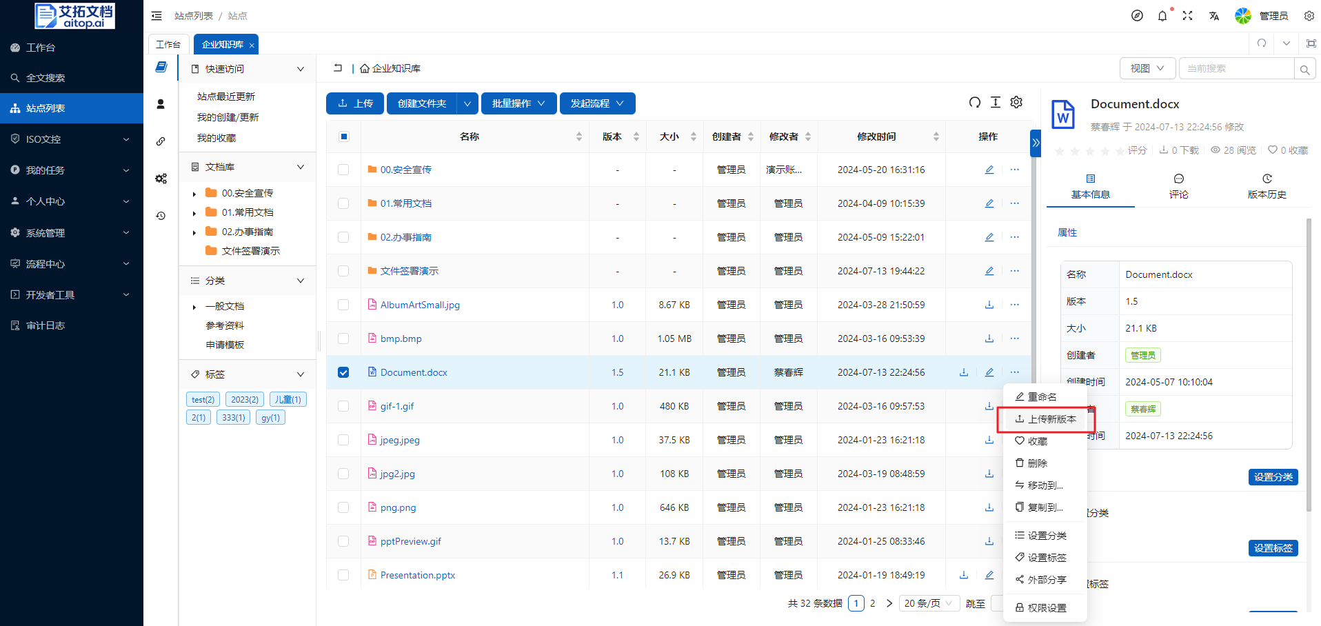 - 点击文件列表操作列的 更多 按钮,选择 上传新版本
