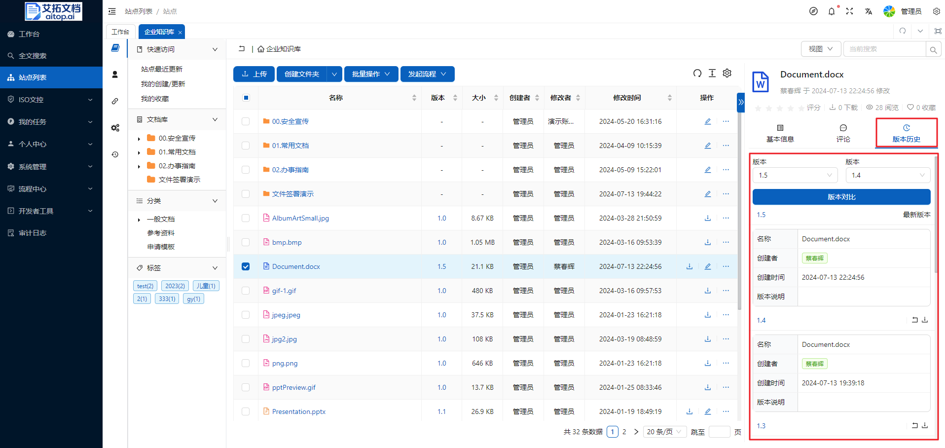 在文件列表选中文件后,可以在右侧属性面板中查看版本历史,进行版本回退、版本对比等操作。